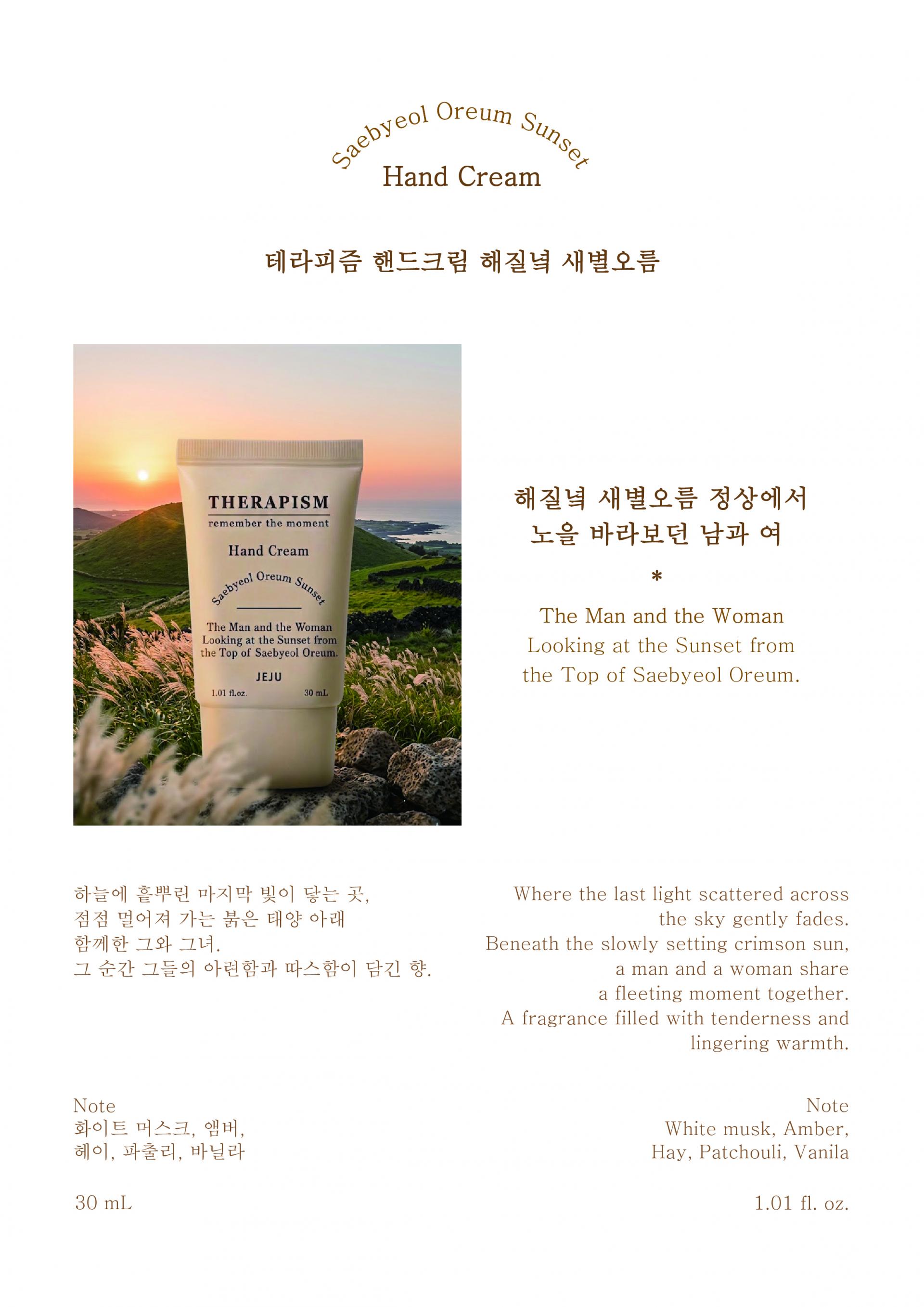 테라피즘 베스트향수 ' 해질녘 새별오름 남과 여' 를 이제 핸드크림으로 만나보세요